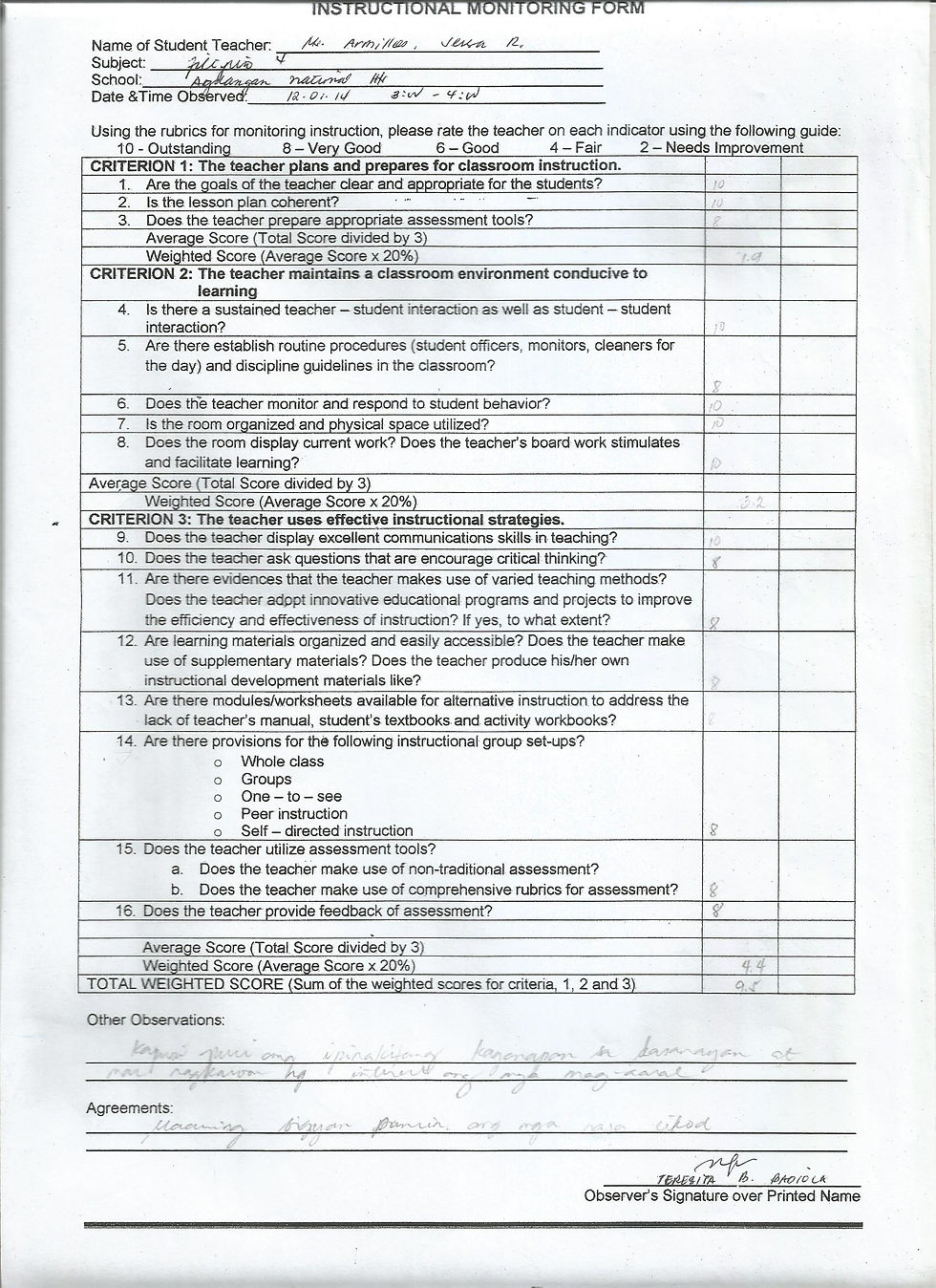 Instructional Observation Sheets...